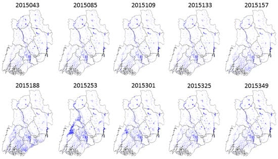 Relatively high frequency of inundation was observed in the Irrawaddy Delta, including the states of Irrawaddy, Rakhine, Yangon and Bago. Inundation of this region is shown in Figure 11 on ten dates from the 2015 time-series. The Delta region is one of the largest rice producing hot spots in the country with a majority fed by interlocking channels of water tributaries. Pockets of aquaculture were also detected and differentiated using the patterns of inundation tuned to seasonality of rainfall and crop phenology. The regions with pockets of aquaculture are within the states of Irrawaddy, Rakhine, Yangon and Bago. Potentially these aquaculture patterns can create confusion with rice cycles if the time series of Sentinel-1 has gaps during key growth stages. Irrigation patterns in the central Dry Zone (including states of Mandalay, Magway and Sagaing) were visible in the time series. Due to low rainfall levels and persistent drought in recent years, portions of this region have irrigation infrastructure to support rice production which was observed (Figure 12).
