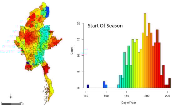 Rice crop start-of-season distribution across administrative units highlighting spatial variability and regional trends in crop calendar.