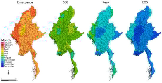 Rice crop calendar during the main wet season crop detected from Sentinel-1 showing mean A. Emergence, B. Start-of-season (SOS), C. Peak, and D. End-of-season (EOS) scaled to administrative units for Myanmar.