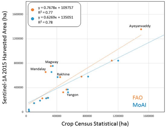 A scatterplot between our harvested area and the available rice census provided by the government at the State level is shown in Figure 15. While these outcomes need to be interpolated and used cautiously, the results indicated generally strong overall agreement with an R2 of 0.78 using robust and transparent approach. Additional adjustments to the processing (i.e., masking, localized tuning) can improve the R2, however this decreases the transferability of the approach. Incorporation of this type of approach into food security DSTs will need to weigh automation vs local tuning as part of their workflow. Further, we feel that the census statistics have such large uncertainty and production was affected by disaster flooding that the mapping approach provides a realistic assessment of rice production in Myanmar. The total harvested rice area was 6,652,111 ha which compares well to recent FAO estimates and most recent IRRI MODIS-derived estimates (6,319,716 ha). However, the IRRI MODIS map does not integrate intensity so a direct comparison between extent and harvest area (extent × intensity) is in appropriate. Further, the IRRI MODIS data is from 2012 MODIS data at 500 m resolution and, we emphasize, detailed maps of the harvested area for Myanmar were not the primary objective of that IRRI effort. All these datasets provide valuable information for a given application. According to FAO Statistics, harvested rice has dropped nearly 20% from 2009 to 2014. Our 2015 Sentinel-derived operational estimates are within 2% of the 2014 estimates by the FAO. This is a difference of only 137,889 hectares. Further, in 2015, the FAO estimated a 3% reduction compared to 2014 due to flooding in July and August that negatively affected production.