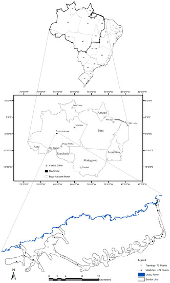 The study site is located in the central region of the Amazonas state, in the Urucu River basin, in the municipality of Coari, Brazil (Figure 1). It has an elongated shape of about 50 km by 8 m buffering an oil duct where access was possible, and covers about 7967 ha. The site is located about 640 km from Manaus (the state capital) and can be accessed only by boat or airplane. The climate is equatorial (Af, according to Köppen classification), with the temperature of the coldest month higher than 20 °C, mean annual precipitation of 2500 mm, and no pronounced dry period. According to Brasil [10], the soils of the region were formed from Tertiary and Quaternary sediments of the Içá Formation, which covers an area of 563,264 km2 (36% of the Amazonas state). They are composed of very fine sandstone, claystone and siltstone. The Holocene alluvium of the Quaternary deposits are related to the current Amazonian drainage networks. In the study area, the main soils include Argissolos (Ultisols) and Cambissolos (Inceptisols) [11,12], most of them with low sum of bases, high aluminum and medium to high sand contents. Some soils in the area present aquic characteristics, especially those near the Urucu River floodplain.