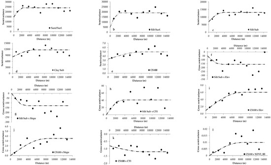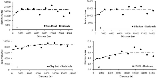 The target soil variables that showed spatial autocorrelation were sand at the surface, silt at the surface and subsurface, clay at the subsurface, and CS100 (Table 4; Figure 2). The CS100 showed the highest range of spatial autocorrelation (8000 m), followed by the clay content at the subsurface (5500 m). Silt at the surface layer had the lowest range (2000 m) and the lowest proportion of the nugget variance over the total variance (that is, nugget-to-sill ratio) among the soil variables.
