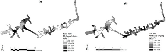In summary, considering the requirements of the kriging methods, most of the soil variables could be mapped by OK and RK, but only a couple could be cokriged. In OK, the variables not mapped included sand at the subsurface, clay at the surface and CS30, which did not show spatial autocorrelation. In RK, the variables not mapped included sand and silt at the subsurface, which lacked significant correlations with the covariates to derive a regression model, and clay at the surface and CS30, whose regression residuals were not spatially autocorrelated. Finally, only silt at the subsurface and CS100 could be mapped by ICOK and HCOK.