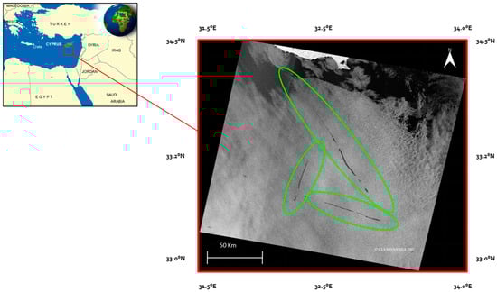 Among the methodologies working in the optical band, the one specifically applied to oil detection based on the general robust satellite technique (RST), named RST-OIL [,,], has already been successfully applied to Advanced Very High Resolution Radiometer (AVHRR) and Moderate Resolution Imaging Spectroradiometer (MODIS) TIR data [,], showing excellent performances with a high level of reliability (no false alarm). In this work, the same approach has been extended to MODIS visible bands to exploit their higher spatial resolution (250 m) than the thermal channel (1 km) to improve the detection sensitivity towards small spills such as in the wakes of ships or illicit vessel discharge. Such a better spatial resolution combined with a high revisit frequency may offer frequent and detailed mapping of oil-affected areas. The oil spill event studied in this paper is an illicit vessel discharge from 18 June 2007 off the south coast of Cyprus, reported by the European Maritime Safety Agency (EMSA) [], which was undetectable by RST-OIL due to the non-adequate spatial resolution of the MODIS TIR data used for this event. The area affected by the event is shown in Figure 1, together with a Radarsat image collected on the same day. Three clear, elongated dark areas are recognizable (green ellipses in Figure 1) and seem to be connected, indicating the movement of a vessel along a triangular path. Several dark areas with a non-uniform shape are also present in the northern part of the scene, close to the Cyprus coastline, probably due to the sea current, representing a typical example of SAR look-alikes.