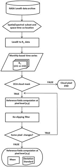 where ρx (x,y,t) is the reflectance (expressed in terms of Rayleigh-corrected reflectance - Rrc) measured in the MODIS channel x (i.e., 1 or 2) at the pixel (x,y) at time (t). Further, μρx(x,y) and σρx(x,y) are the corresponding reference fields (temporal average and standard deviation, respectively) computed by analysing a long-term data set of cloud-free satellite records collected at location (x,y) in the same observational conditions (the same month of the year and the same time of acquisition) of the image under investigation. Flowchart depicted in Figure 2 provides a summary of the different steps implemented to produce the reference fields. Firstly, all the available MODIS-Aqua images of the month of June (from 2002 to 2010) acquired over the area affected by the event in the 9–12 p.m. GMT temporal range were collected. In detail, about 250 MODIS-Aqua data (level 0), downloaded from NASA ocean color web site [], were converted to calibrated radiances using SeaDAS V7.3. It is worth nothing that the number of the investigated images (i.e., 250) is higher than the one found as minimum value (i.e., 80) to be representative of the investigated long-term time-series signal by an independent study applied on RST approach []. Then Rrc data were derived for MODIS bands 1–2 and mapped to a WGS84 Lat/Long projection, producing a subset sized 800 × 800 and centred at 34°N 32.5°E (e.g., Figure 3) for each pass. Secondly, starting from this long-term Rrc series, temporal average (μρx(x,y)) and standard deviation (σρx(x,y)) reference fields were computed at a pixel level over this area for MODIS channels 1 and 2. Before finalizing such a procedure, a cloud screening test was applied to discharge any cloudy-affected pixel. Cloud-free satellite records were selected by implementing the One-channel Cloud-detection Approach (OCA) [,] using, within an RST-based scheme, the combination of the signal measured in MODIS channels 1 and 32 (11.770–12.270 µm) at a spatial resolution of 1 km and then downscaled to 250 m. In detail, pixels showing at the same time statistically high reflectance values “AND” (i.e., as a logical operator) low brightness temperatures were considered as cloudy affected. Furthermore, a kσ iterative procedure was implemented at a pixel level to remove possible outliers (known or not) from the investigated series []. At the end of this phase, four reference fields (one temporal mean + one standard deviation x two channels) were produced for the month of June. Among them, μρx(x,y) represents the expected value (i.e., in unperturbed conditions) at pixel level of the investigated signal, while σρx(x,y) describes its natural variability (i.e., the statistical dispersion of the data set values around the mean). Hence ⊗ρx(x,y,t), as computed in Equation (1), is a measure of how much the signal deviates from its normal behaviour taking also into account its variability. Such an index is, for construction, a standardized variable which should show a Gaussian behavior (i.e., mean = 0 and standard deviation = 1). Therefore, the higher the absolute value measured, the lower the probability of occurrence. Namely, the probability decreases from about 2.5% for |⊗ρx| > 2 to 1.5% for |⊗ρx| > 3, and even lower values for increasing |⊗ρx| values [] in case of a perfect Gaussian distribution. Therefore, in the presence of oil, which should represent a perturbation of the normal seawater condition, such an index will show high positive values in case of a positive contrast and the opposite (i.e., high negative) in case of a negative one.