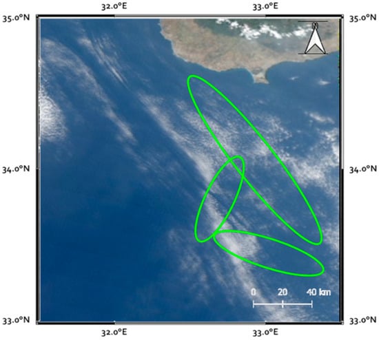 Unfortunately, the whole area affected by the event was covered by clouds, masking the sea surface and preventing a reliable analysis. Owing to the high revisiting time offered by sensors aboard weather satellites such as MODIS, the same area was sampled by Aqua at 10:50 a.m. GMT as shown in Figure 4 (with the same RGB combination of the previous figure).
