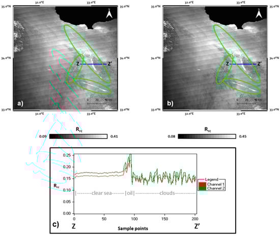 In this image, thanks to the different conditions of the observation in terms of sun-satellite geometry and atmosphere contribution from the previous Terra acquisition, very few elongated areas characterized by a positive contrast are clearly evident, approximately at the same positions of the oil spill reported by EMSA (green ellipses in Figure 4). Some clouds are also present, more evident in the northwest corner of the image. By making a spatial profile on the related MODIS Rrc channel 1 and 2 images (depicted in grey tones in Figure 5a,b) in correspondence to the area within one of the green ellipses (Z-Z’ blue transect in Figure 5a,b), an increase of the reflectance is visible (Figure 5c), which reaches values higher than the one produced by the very low, thin stratocumulus (signal with a high frequency variability in the right part of the graph). The increase in reflectance is really relevant, up to 0.1%, which is very high for clean seawater.