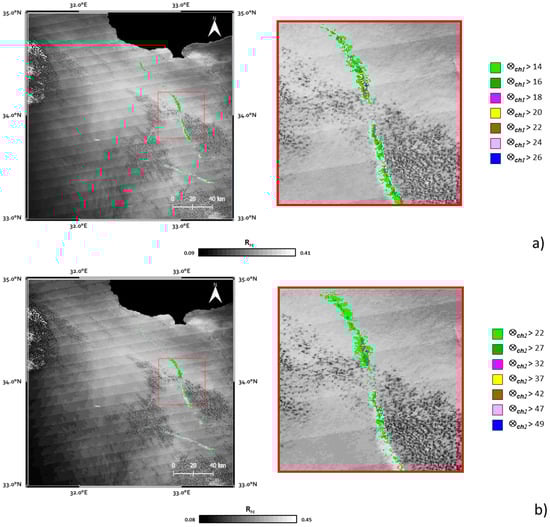 Application of ⊗ch1 index (a) and ⊗ch2 (b) to the MODIS image of 18 June 2007 at 10:50 a.m. GMT. In the background, the corresponding Rrc images already shown in Figure 5a,b; land is masked in black. The two red insets highlight the few pixels detected as anomalous at the S/N levels reported in the legends.