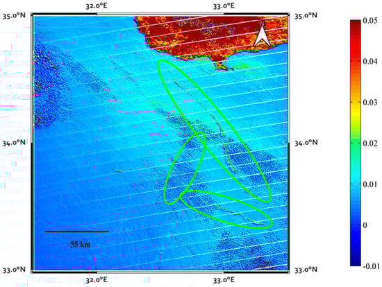To further assess the accuracy of the achieved results, the event image (Figure 4) was analyzed implementing the Floating Algae Index (FAI) following guidelines indicated by []. FAI was calculated using Rrc at 645, 859, and 1240 nm []. These wave bands in the red and infrared regions are less sensitive to atmospheric effect and the presence of colored, dissolved organic matter (CDOM). The corresponding FAI map (Figure 9) generally indicated higher values in the oil-contaminated areas than in adjacent oil-free areas. It is also worth noting that at the edge of the wind-driven feather of oil slicks, the FAI in the oiled water was lower than in the non-oiled water. This phenomenon could be related to the thickness of the oil slicks. Thin oil sheens indicated low FAI values as demonstrated by [], while thick oil slicks forming mats floated on the surface and indicated high FAI values. Rrc spectra (data not shown) over the contaminated areas did not show chlorophyll-a fluorescence peaks in the red region which can be clearly distinguished when algal blooms happen. This corroborates that algal blooms can be ruled out of the causes of high FAI values shown in Figure 9. On the other hand, it can be seen that the FAI over land is much higher than over water with values generally >0.02, and areas with FAI < 0 are due to water such as reservoirs. A general good agreement exists between the FAI map and the results provided by RST, indicating the potential of the latter in giving reliable results. It should also be pointed out that the texture of oil spills is different from that of algal blooms. However, these two phenomena are, to some extent, related. Oil can kill snails and other algae grazers, which is then favorable for a period of unimpeded phytoplankton growth []. The algal bloom in 2010 in the Gulf of Mexico after the Deepwater Horizon oil spill is one of the examples across the world [].