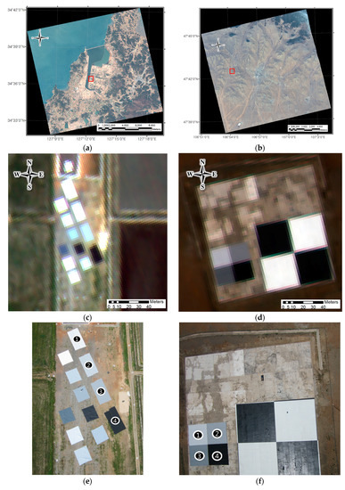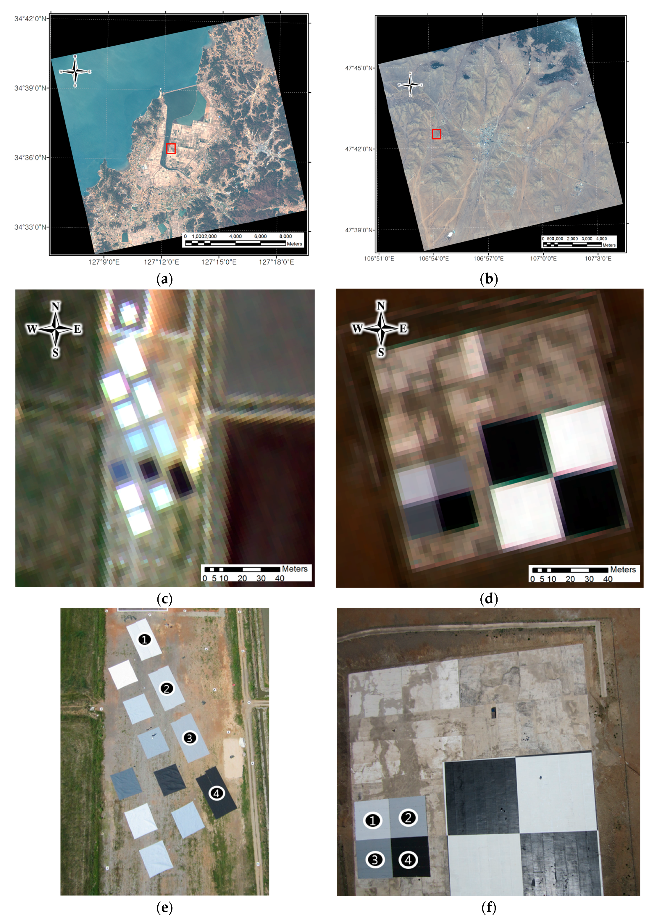In this study, we selected two field campaign sites, Goheung (GH) County, South Korea (34.60°N, 127.20°E), and Zuunmod, Mongolia (MG) (47.721°N, 107.064°E). The locations of the field campaigns are shown in Figure 1a,b. In the first field campaign at Goheung (Figure 1a), we obtained cropped images of the tarp areas from the KOMPSAT-3A MS, and their corresponding unmanned aerial vehicle (UAV) images. These images are shown in Figure 1c,e, respectively. We used the 10 × 20 m tarps numbered from one to four, shown to the right of Figure 1e. We chose these over the smaller 10 × 10 m tarps to mitigate the PSF effects caused by the CCD camera [18]. These can be reduced by increasing the spatial extent of the target. The 10 × 20 m tarps shown in Figure 1c were represented by 5 × 10 pixel regions in the images. The edges, which were clearly influenced by the surrounding reflectance, are semitransparent. By visually inspecting these tarp areas, we can see that they are represented by areas of 3 × 8 pixels. Only pixels that were clearly part of the tarp area were used to determine the ground reference values for the KOMPSAT-3A DN. According to [19], in order to obtain reasonable vicarious radiometric calibration results, the radiometric tarp must occupy an area of 5 × 5 pixels or more when observed from the satellite. The authors of that study used 20 × 20 m tarps to vicariously calibrate IKONOS satellites. The spatial resolution of the IKONOS satellites was 4 m. As the KOMPSAT-3A satellites have an MS channel spatial resolution of 2.2 m, areas represented by 5 × 5 pixels, which correspond to areas of 11 × 11 m or larger, can be used for vicarious calibration. The tarps used in the Goheung field observations were sufficiently large in the vertical direction, but 1 m too small in the horizontal direction. This made environmental effects more pronounced. In the second field campaign over Zuunmod (Figure 1b,d,f), we used larger radiometric tarps with dimensions of 20 × 20 m, as shown in Figure 1d,f. In Figure 1d, we can see that the areas which are clearly tarps, occupy a minimum of 8 × 8 pixels in the KOMPSAT-3A MS images. Hence, for vicarious calibration, it is better to use larger radiometric tarps, like those used in the second field campaign. The observations of these tarps were less affected by the environment.