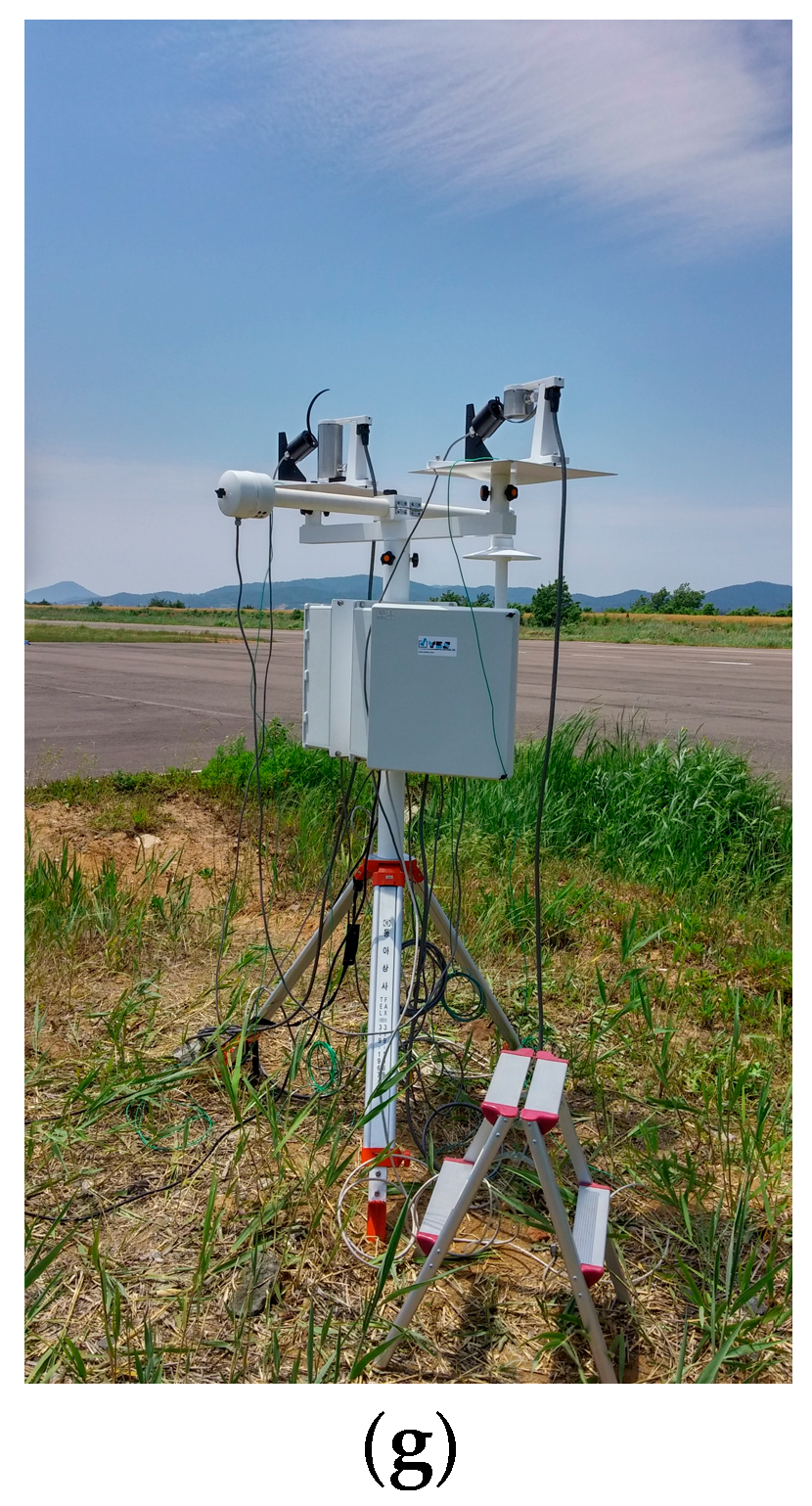 (a) KOMPSAT-3A RGB image of Goheung County, South Korea, acquired on 27 March 2015 and (b) KOMPSAT-3A RGB image of Zuunmod, Mongolia, acquired on 18 June 2015. (c,d) are cropped KOMPSAT-3A MS images of the tarp areas in Goheung and Zuunmod. These areas correspond to the red squares in (a,b). Finally (e,f) are UAV RGB images taken before satellite pass time and show the locations of the deployed radiometric tarps. (g) A picture of the MFRSR instruments deployed at the Goheung site.
