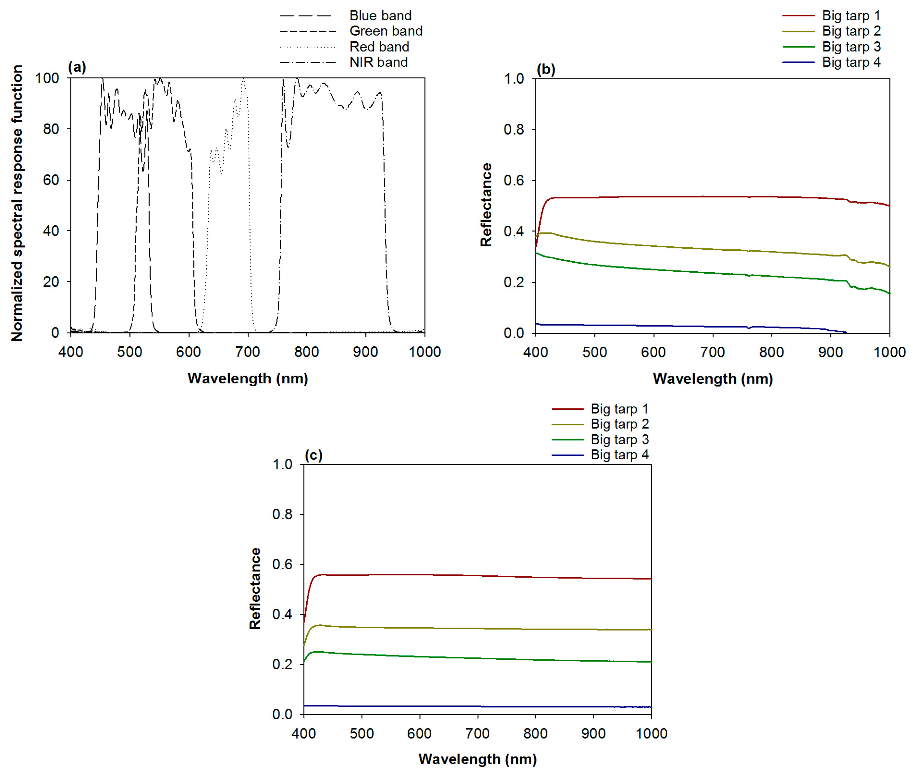 When fabricating the radiometric tarps, we selected reflectance rates in the range 3% to 56%. We assumed that these rates would facilitate the radiometric calibration process, as, according to previous studies [20], the natural reflectance of land to light in the visible to NIR spectrum is usually less than 60%.