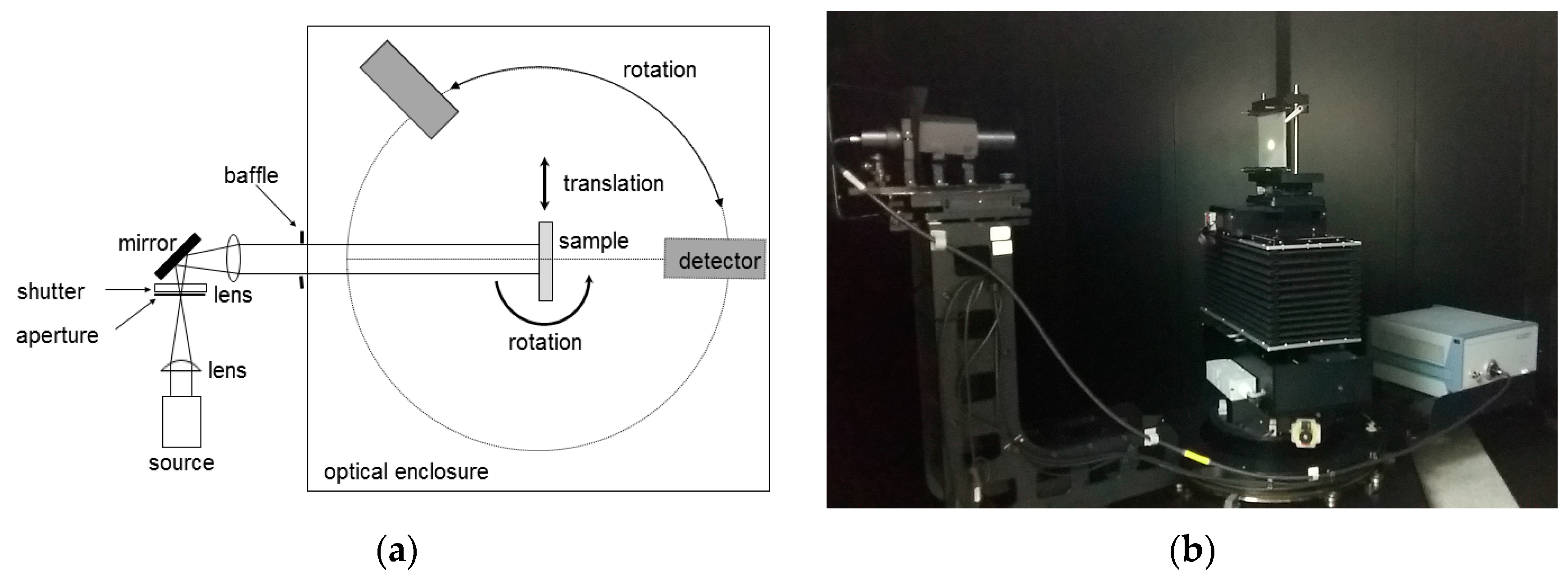 - Hwang, J.S. Absolute measurement of hyperspectral and angular reflection. Appl. Opt. 2014, 53, 6216–6221. [Google Scholar] [CrossRef] [PubMed]