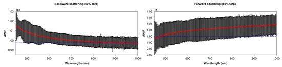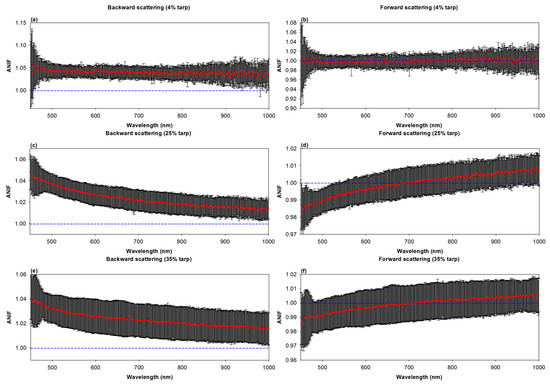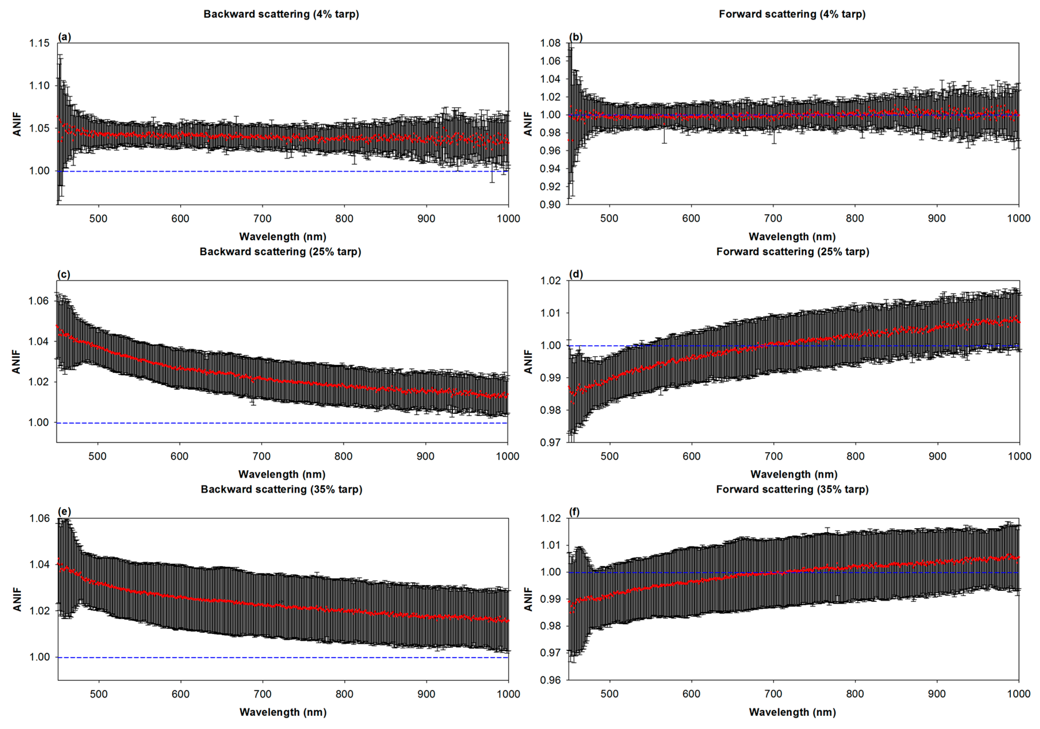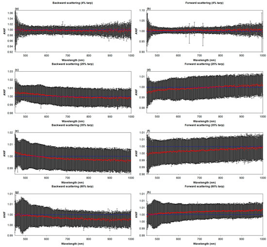 Figure 5 and Figure 6 show the estimated ANIF values according to each radiometric tarp (from 4% to 60% reflectance), obtained by reflecting the geometries of the Goheung and Zuunmod field campaigns, respectively. For example, in Figure 5, for estimating ANIF, the laboratory-based BRDF measurement geometry condition is 21.3° incidence with ±9.9° detection (negative is backward scattering and positive is forward scattering), which is the same as the satellite observation geometry for the Goheung field campaign. In Figure 6, the experiment geometry condition is 26.6° incidence with ±2.9° detection, the same as the Zuunmod field campaign. As shown in Figure 5, we found slightly inverse symmetrical patterns of ANIF values for all radiometric tarps, except for the 4% tarp, indicating two important facts. The first is that the changeable sun–tarp–sensor geometry should be considered, in order to determine which scattering phases would be reflected by checking geometrical conditions. The second is that radiometric tarps would be expected to have effects on BRDF values in the azimuth direction. We inferred that the inverse symmetry of BRDF values between backward and forward scattering originated from the dependence of the tarps’ weft and warp thread orientations on the diffuse reflectance [27]. Under backward scattering conditions, the ANIF values, and even the uncertainties, deviated from 1, except for the 60% tarp, which approached 1 as the wavelength increased (Figure 5a,c,e,g). This means that the effects of the radiometric tarps on BRDF are more effective for shortwave ranges, such as the blue and green bands. In the case of forward scattering, not only were ANIF values near 1, but an ANIF value of 1 was included in the uncertainty range over most of the measurement wavelengths (Figure 5b,d,f,h). For the Goheung field campaign site (Table 2), the ANIF value for backward scattering was applied, in order to normalize the satellite reflectance, because the relative azimuth angle between satellites and the sun is 25.4°.