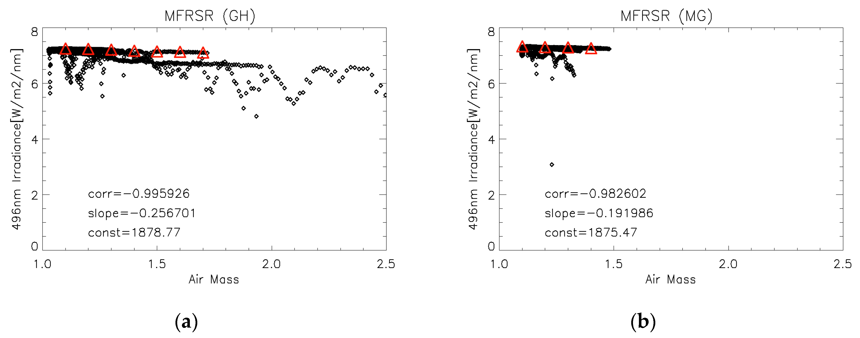 In the case of AOD estimation with MFRSR, we first measured the total, direct, and diffuse irradiances at the Goheung and Zuunmod field campaign sites. In general, the well-known Langley regression method is widely used to estimate AOD by retrieving the TOA irradiance (I0), by securing at least two months of continuous measurements that are long enough to reduce the statistical variability to less than 1% per day [33]. However, it is difficult to acquire long-term continuous observations during vicarious calibration field campaign periods. In this study, to overcome this limitation of the Langley regression method, the modified Langley correction method, using the maximum value composite (MVC) of the largest irradiance values at a given air mass, was applied. Lee et al. [34] proved that the suggested MVC-based Langley method (hereafter, LangleyMVC) showed reasonable statistical results for nearly impossible-to-find days that meet the requirements for performing traditional Langley analyses.