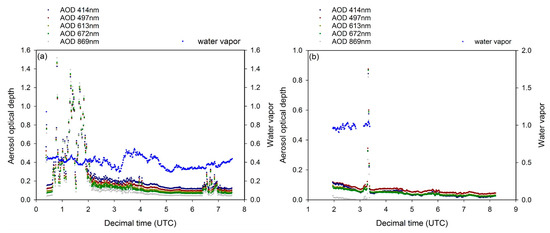 In the case of the Zuunmod field campaign, a discontinuous pattern was found after 3:00 UTC, because unrealistic TOD values were recorded. According to the MFRSR measurements of Zuunmod, stable clear skies were detected, indicating that we can select the value for water vapor at the time closest to the KOMPSAT-3A passing time, by assuming that the variation in column water vapor is insignificant. Table 3 shows selected values for AOD, water vapor, and ozone at satellite overpass times, for the Goheung and Zuunmod sites.