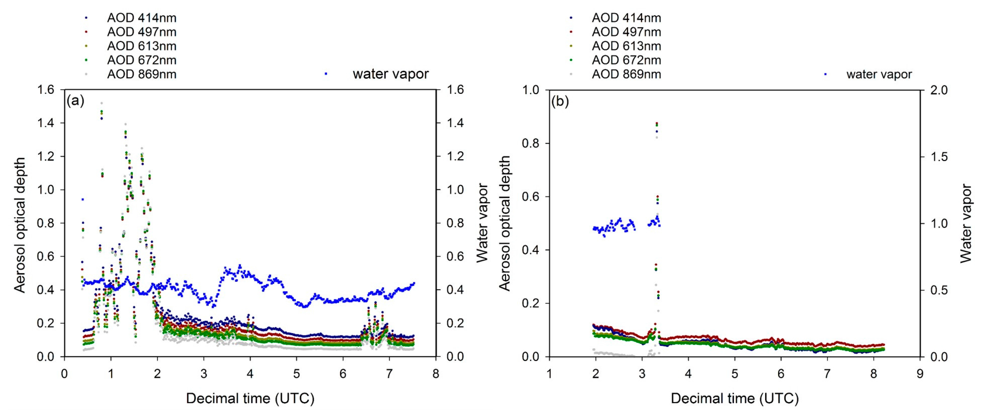 Temporal AOD and column water vapor (blue dots) using MFRSR measurements for the Goheung (a) and Zuunmod (b) field campaigns.