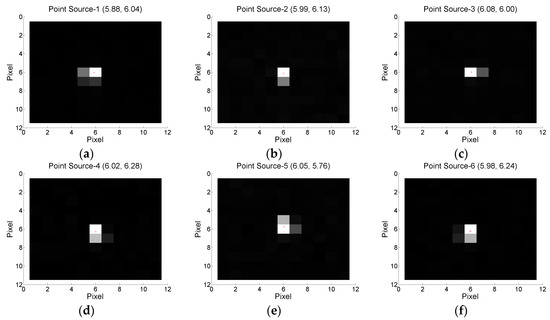 The PSF, which is the electronic response of a sensor system to a point radiator, is an important criterion of image quality [40]. How well the PSF is defined is also important, as the PSF of the CCD camera can seriously affect the accuracy of radiometric calibration and measurement [41]. In addition, the impact of the PSF on the optical sensor results in considerable uncertainties in derived MODIS land cover products [42]. Therefore, we also newly considered the effects of the PSF by observing images of a point source, such as a bright star, to characterize the AEISS-A sensor response to the point source [43,44]. We observed stars using KOMPSAT-3A MS to measure the PSF of the AEISS-A sensor during the IOT periods. The satellite attitude control system can be used to observe stars by rotating KOMPSAT-3A during Eclipse orbits. To select an effective bright star source, we first eliminated background noise, and then applied a threshold value by considering a high signal-to-noise ratio (SNR) and an unsaturated DN value. To select stars with radiances within the detection range of AEISS-A, we referred to the Gunn & Stryker Stellar spectrophotometric atlas, which contains information on the visible spectra of 175 stars [45]. Figure 9 shows measured star images from the KOMPSAT-3A-combined MS bands. Figure 9h shows the overlaid KOMPSAT-3A MS images of selected stars, and the highest points of the images are the locations of the stars. Based on Figure 9h, 3 × 3 pixels were the sensitive area for PSF effects, indicating that the adjacency effects can be reduced and PSF compensated for, by using tarps that are large enough, such as those occupying 5 × 5 pixels (11 × 11 m in the nadir direction in the KOMPSAT-3A MS images) or more.
