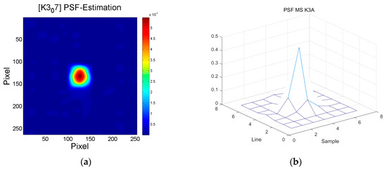 To reduce the diffraction effects by AEISS-A CCD sensor characteristics, the PSF of the KOMPSAT-3A MS was generated from the star image data acquired by the MS bands of KOMPSAT-3A. Figure 10a shows the observed PSF of KOMPSAT-3A AEISS-A, as a function of radius at 25% full width and half maximum (FWHM). Although not a circle, the shape of the PSF is similar to a circularly symmetric Gaussian-like shape. Then, converting the matrix of the PSF based on star observations, the optical transfer function (OTF) of the system was simulated by Fourier transformation of the simulated PSF in Figure 10b. The MTF of KOMPSAT-3A MS was determined by the magnitude of calculated OTF.