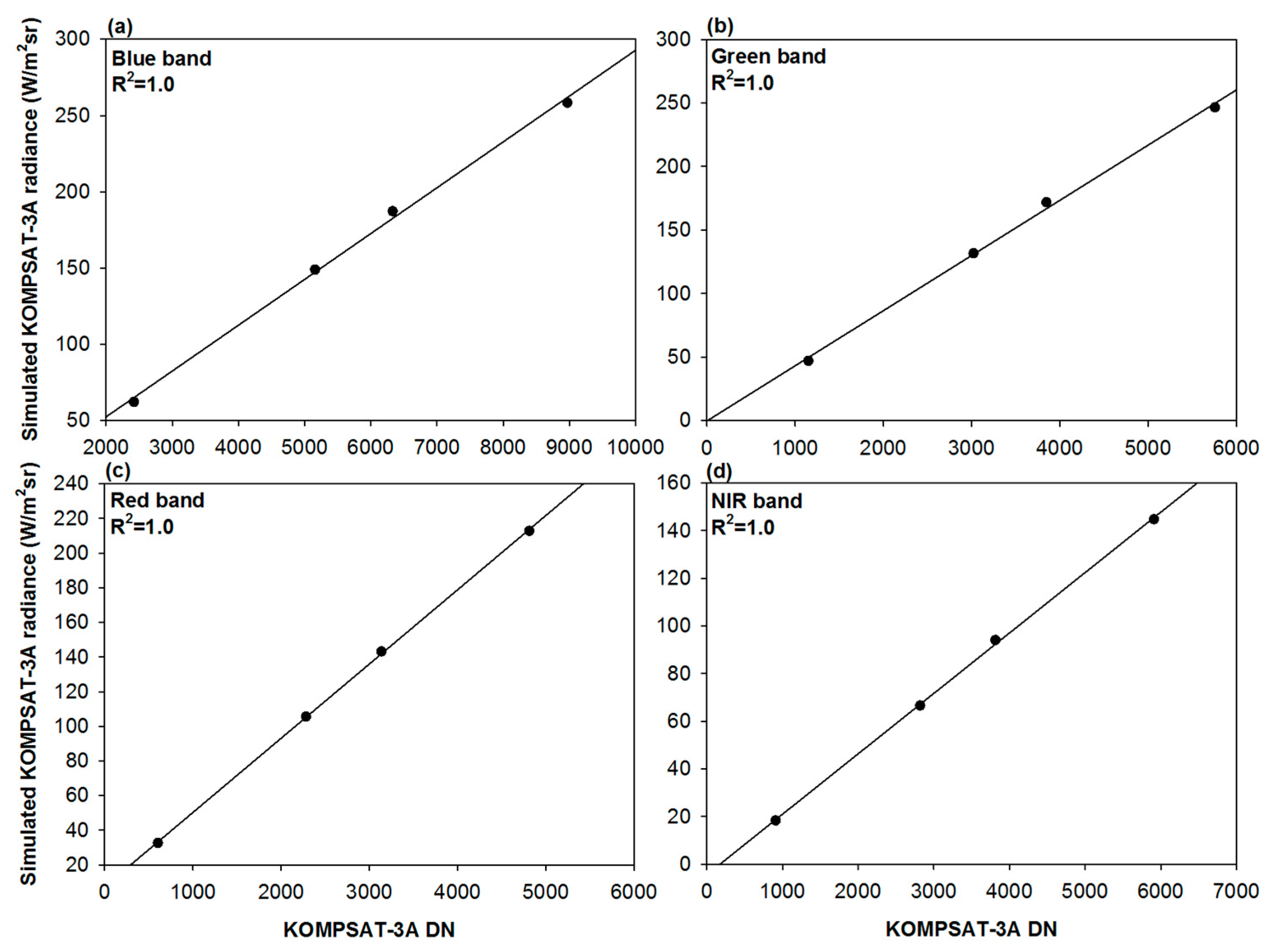 The main purpose of this paper is to report on the initial conditions of the radiometric calibration of KOMPSAT-3A during the IOT periods, performed on the basis of vicarious calibration methods. In this study, the Second Simulation of the Satellite Signal in the Solar Spectrum (6S) radiative transfer model [16] was used to simulate the amount of radiance observed by the sensor at the top of atmosphere (TOA) level. The radiometric calibration method of KOMPSAT-3A is based on the previous KOMPSAT-3 vicarious algorithm [17], but the input data processing for the 6S radiative transfer model was improved. We carefully processed the input data, such as laboratory-based bidirectional reflectance distribution function (BRDF) measurements of each of the tarp samples, with a hyperspectral gonioreflectometric instrument for BRDF correction, and multifilter rotating shadowband radiometer (MFRSR) measurements for atmospheric constituent parameterization. These measurements included the aerosol optical depth (AOD), amount of water vapor, and point spread function (PSF) simulations of AEISS-A with star observations, which can be compared with a previous study [17], because accurate input parameters lead to accurate simulations of the TOA radiance, received by each of the KOMPSAT-3A MS bands. Based on carefully prepared input parameters, we estimated the simulated TOA radiance received by KOMPSAT-3A MS and compared it with the KOMPSAT-3A DN in order to determine the DN-to-radiance coefficients, which indicated that radiometric conversion information is useful for the quantitative application user group.