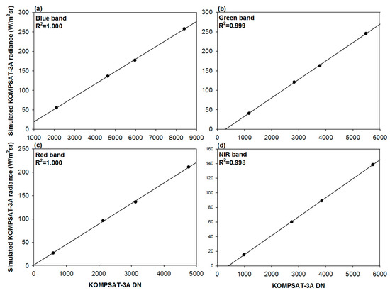 Scatterplots of KOMPSAT-3A DNs and simulated radiance at the sensor for all spectral bands during the first Goheung field campaign. (a–d) show blue, green, red, and NIR bands, respectively.