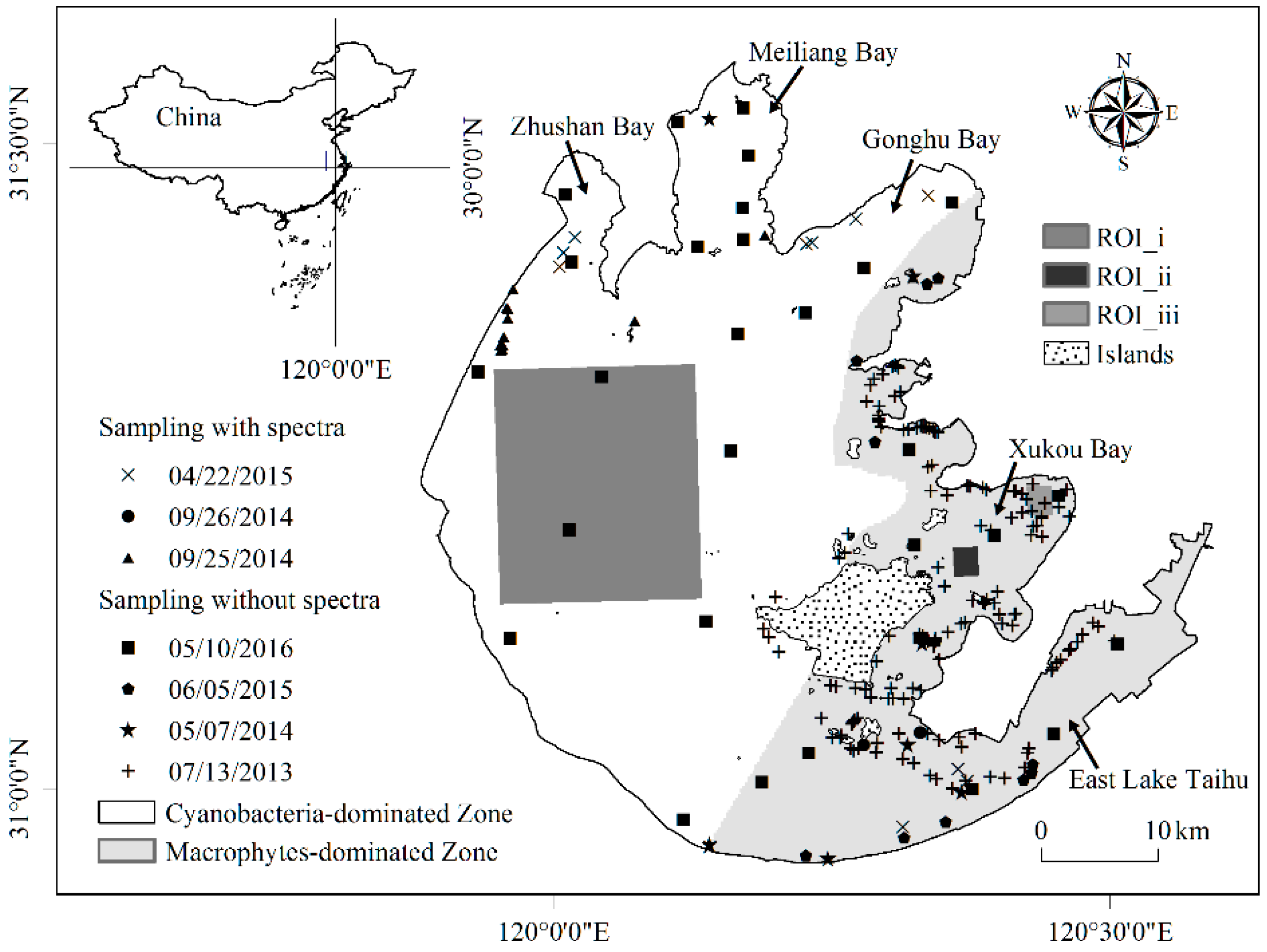 - Zhao, D.; Lv, M.; Jiang, H.; Cai, Y.; Xu, D.; An, S. Spatio-temporal variability of aquatic vegetation in Taihu lake over the past 30 years. PLoS ONE 2013, 8. [Google Scholar] [CrossRef] [PubMed]