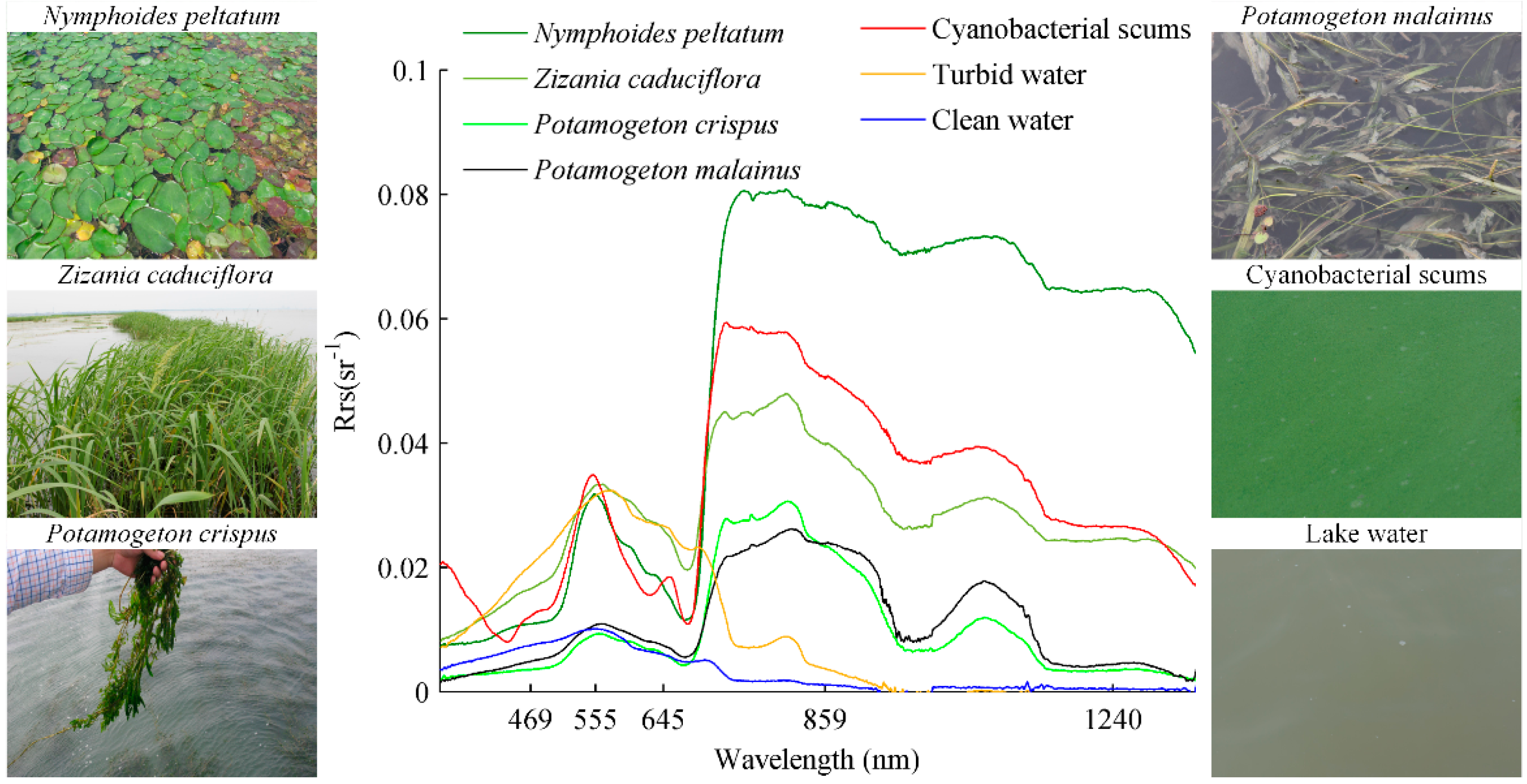 The in situ reflectance spectra and corresponding photographs of water, turbid water, cyanobacterial scums, and some typical aquatic macrophytes observed in Lake Taihu. Spectra were determined by the average spectra of each aquatic macrophytes.