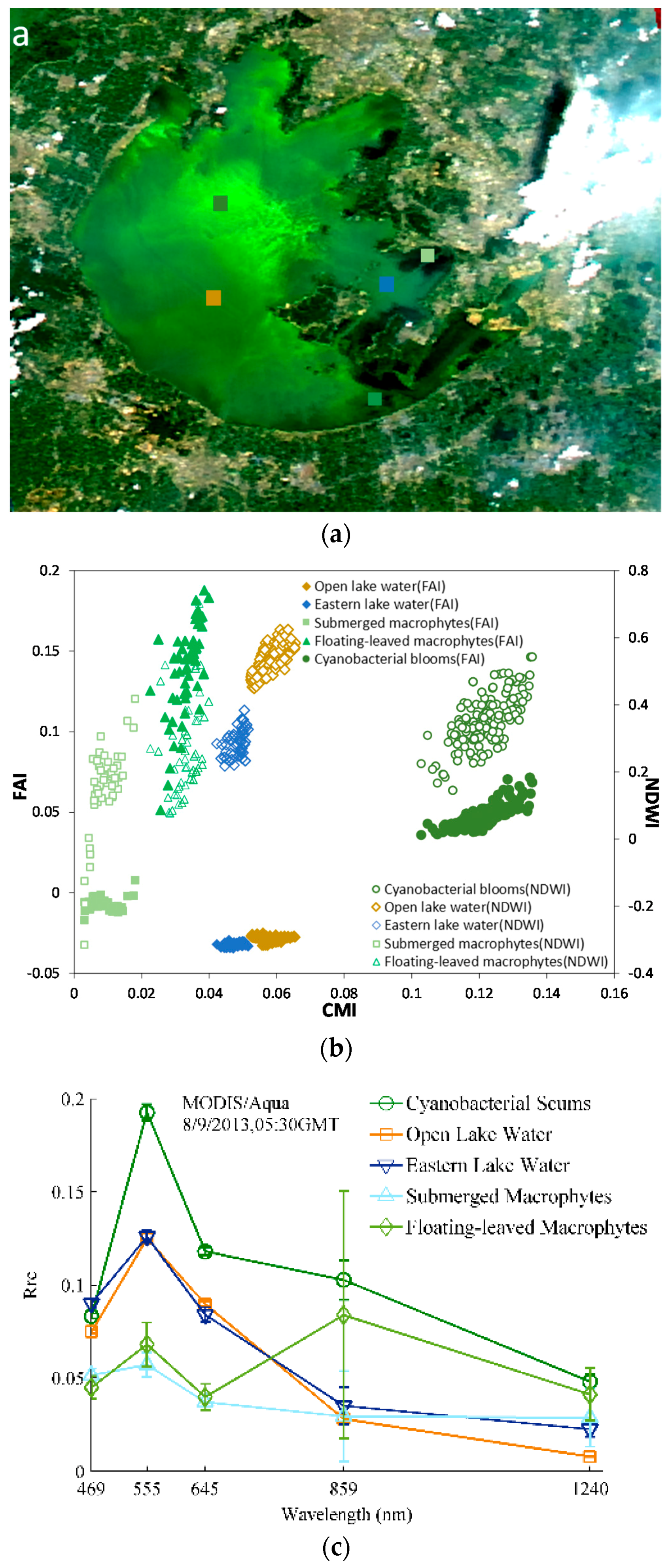 RGB image (a), the relationship of Cyanobacteria and Macrophytes Index (CMI), Floating Algae Index (FAI), and Normalized Difference Water Index (NDWI) (b) and the Rayleigh-corrected MODIS spectral reflectance (Rrc(λ)) (c) of lake areas with different optical conditions on 8 September 2013 GMT.