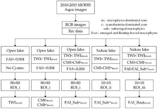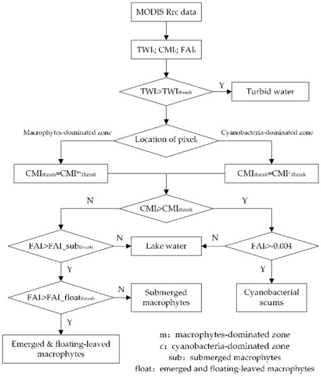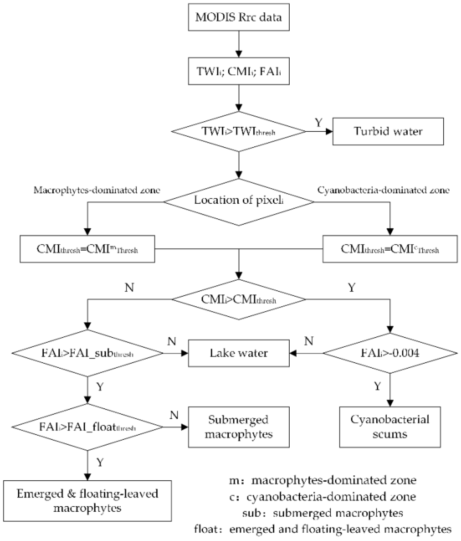 A classification decision tree based on these relationships was constructed with five steps (Figure 4). Step 1: identify and remove pixels of turbid water by TWI; Step 2: chose the CMI and FAI thresholds due to the pixel location (cyanobacteria-dominated or macrophytes-dominated zone); Step 3: identify which is existing in the pixel, cyanobacterial scum or aquatic macrophytes by CMI threshold; Step 4: if cyanobacterial scum exists, identify lake waters using FAI = −0.004; Step 5: if aquatic macrophytes exists, distinguish between floating and emergent/submerged macrophytes using FAI threshold.
