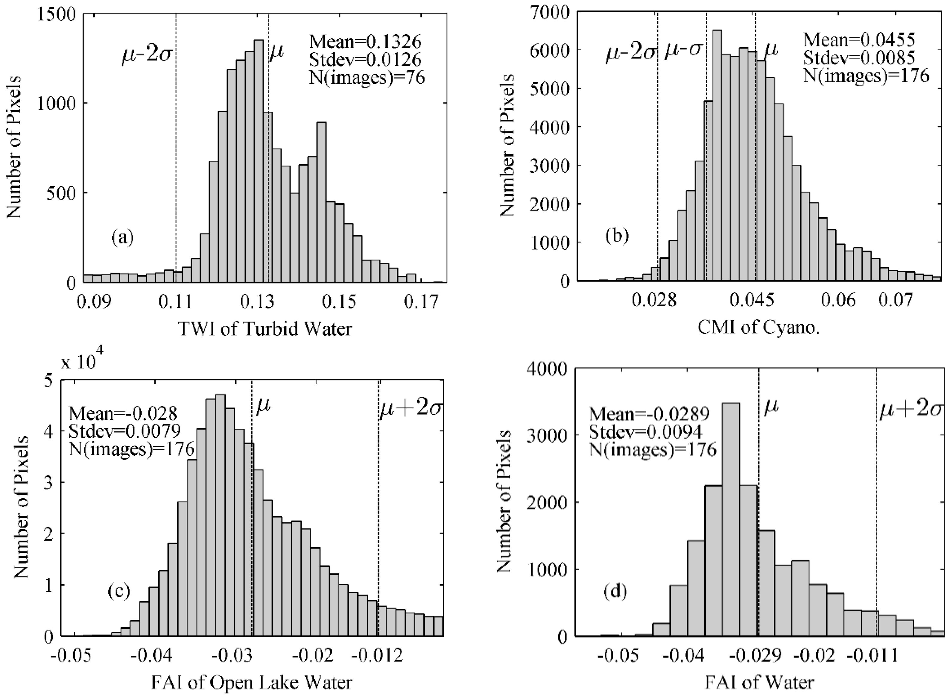 Considering the location and timing of elevated turbidity in Lake Taihu, a region of interest (ROI_i) with 80 × 80 pixels in the open lake was chosen and 76 images from December to February were visually checked for cyanobacterial scums and aquatic macrophytes. All pixels, with FAI > −0.004, were put together to determine TWI thresholds (Figure 6a). Based on the near normal distribution with a mean (μ) and standard deviation (σ) of 0.1326 and 0.0126, the TWI threshold for turbid waters was 0.107 (μ − 2σ).