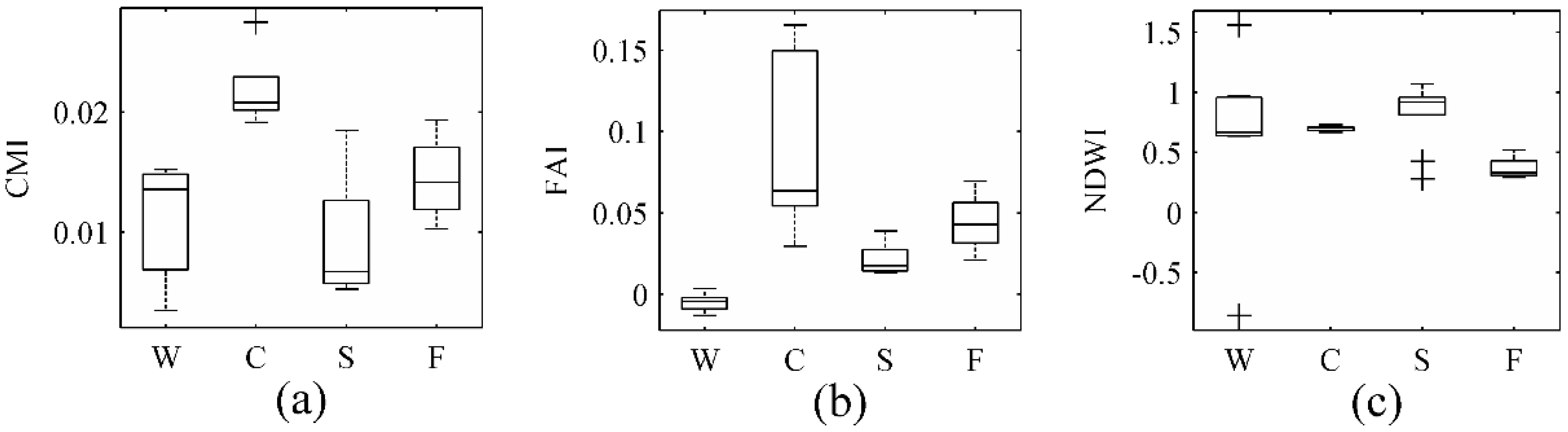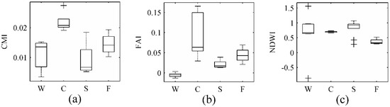 Box-and–whisker plots of CMI (a), FAI (b) and NDWI (c) for lake water, cyanobacterial scums, macrophytes based on in situ reflectance spectra of Lake Taihu. The solid line in the box represents the median value. The upper and lower fences represent the 1st and 3rd quartiles (Q1 and Q3), respectively. The lower and upper whiskers were calculated from (Q1 − 1.5 × IQR) and (Q3 + 1.5 × IQR), respectively, where IQR is the inter quartile range represented by the width of the box (i.e., Q3 − Q1). The data above or under the whisker were defined as the outliers and are shown as cross. (W: Lake water; C: Cyanobacterial scums; S: Submerged macrophytes; F: Emergent and floating macrophytes).