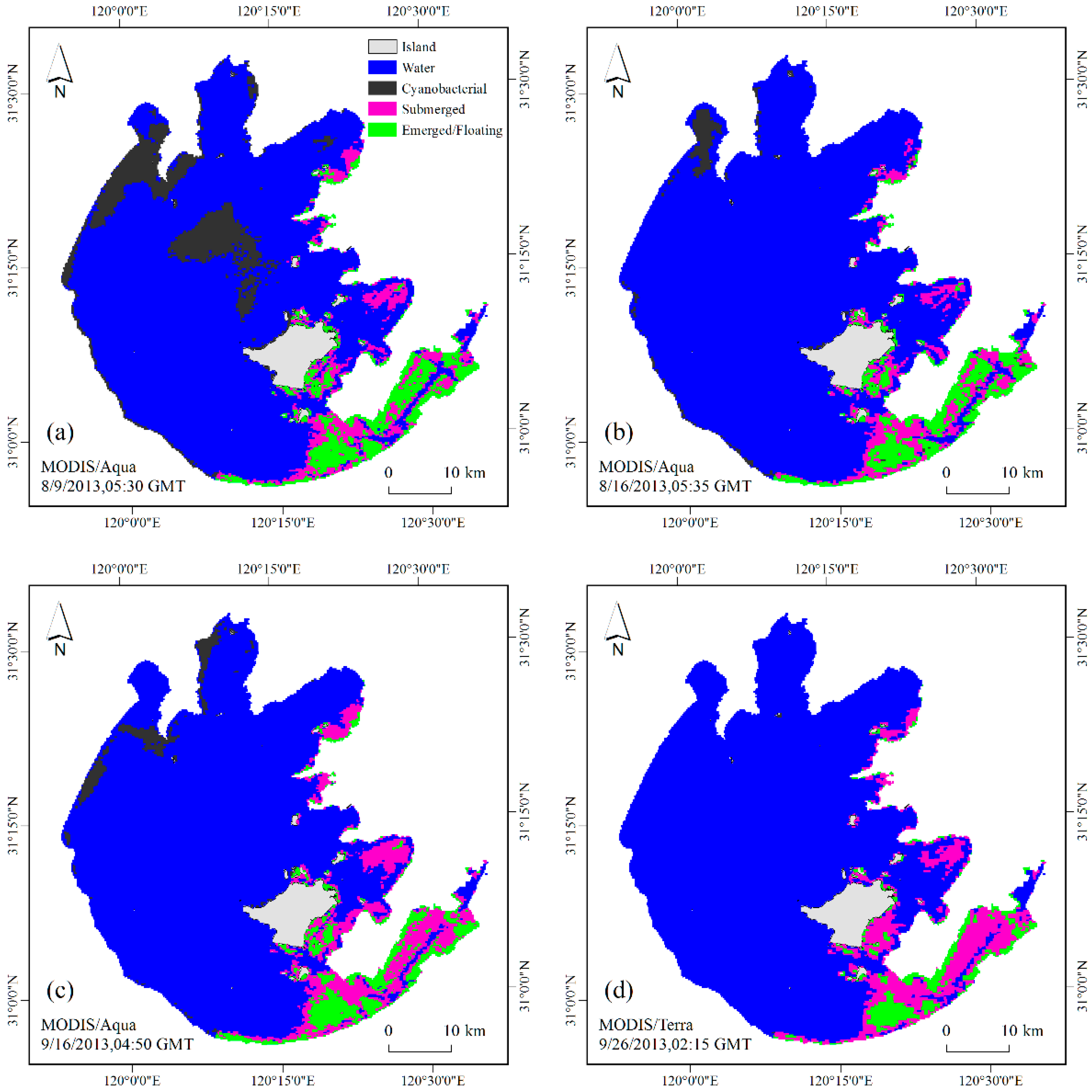 High-spatial resolution HJ-CCD data were used to validate spatial distributions of water, cyanobacterial scums and different aquatic macrophytes for 9 and 16 August, and 16 and 26 September 2013 (Figure 8). Aquatic vegetation spatial distributions on 16 August and 26 September 2013 were provided only in the eastern part of Lake Taihu by Luo’s CT method [66] using HJ-CCD data. The two datasets showed consistent spatial distributions of aquatic macrophytes in the macrophytes-dominated areas: in the south shore of Gonghu Bay, there existed many submerged macrophytes and sparse floating macrophytes; submerged macrophytes dominated Xukou Bay; floating macrophytes were mainly located in the East lake especially in summer. However, emergent macrophytes distributed dispersedly close to the shores were more difficult for MODIS data to identify.