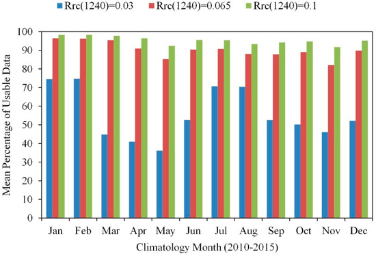 The Rrc data were mapped to a cylindrical equidistant projection for further analysis. First, the Rrc data at 645 nm, 555 nm, and 469 nm were used to compose the Red-Green-Blue true color images to screen for clouds and sun glint. After visual inspection, a total of 176 data granules between 2010 and 2015 (Table 4) were found to contain no cloud cover and sun glint, therefore suitable for thresholds determination and method development.