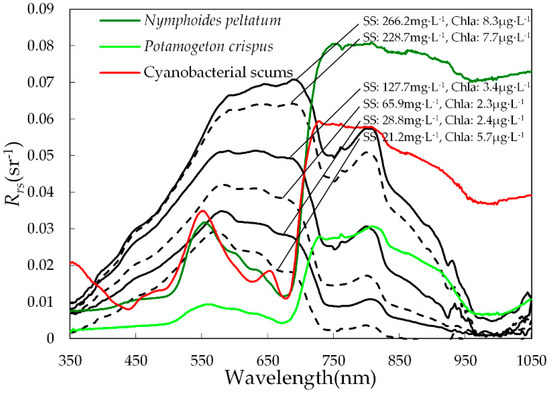 The reflectance spectra of cyanobacterial scums not only had the typical chlorophyll-a and phycocyanobilin absorption at 442, 665, and 620 nm respectively, but also an increase in wavelengths ranging from 700 and 1800 nm with chlorophyll-a concentrations compared to that at visible and longer than 1900 nm range [67]. This is similar to reflectance spectra of aquatic macrophytes.