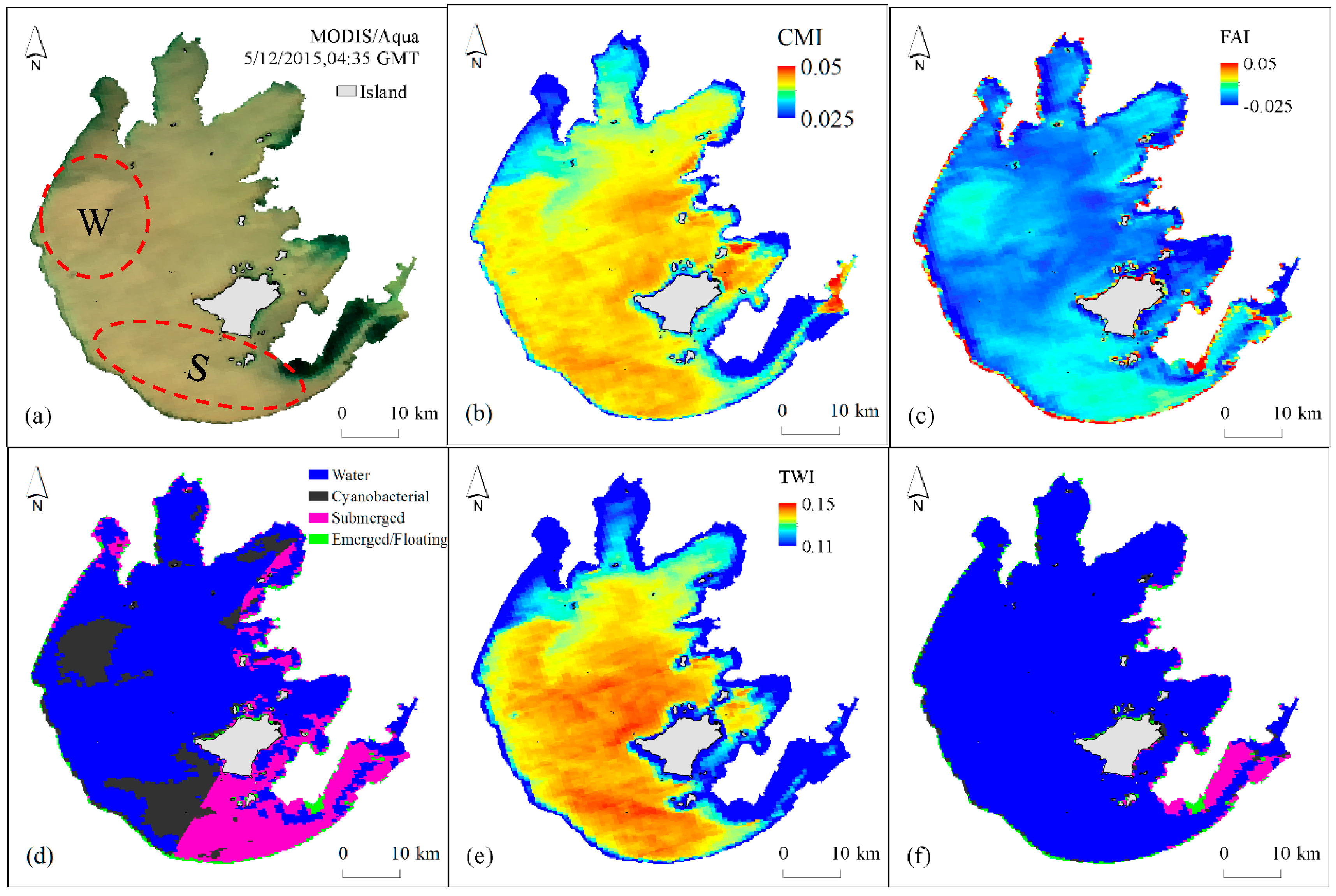 Based on the existed FAI threshold for cyanobacterial scums in Lake Taihu, FAI > −0.004 [47], the CMI threshold was based on 176 images from ROI_i, which satisfied TWI ≤ 0.107 and FAI > −0.004 at the same time. The CMI distribution of cyanobacterial scums pixels was also in a normal fashion with μ = 0.0455 and σ = 0.0085 (Figure 6b). The priori knowledge on Lake Taihu shows that the macrophytes-dominated zones are located in the east sections of the lake [65]. In order to minimize the false positive, we used two different CMI thresholds for detecting cyanobacterial scums in cyanobacteria-dominated zone and macrophytes-dominated zone (Figure 1). For cyanobacteria-dominated zones, we chose 0.0285(μ − 2σ) as the CMIathresh, and for non-cyanobacteria-dominated zones we chose a more strict 0.0455(μ) as CMIgthresh.