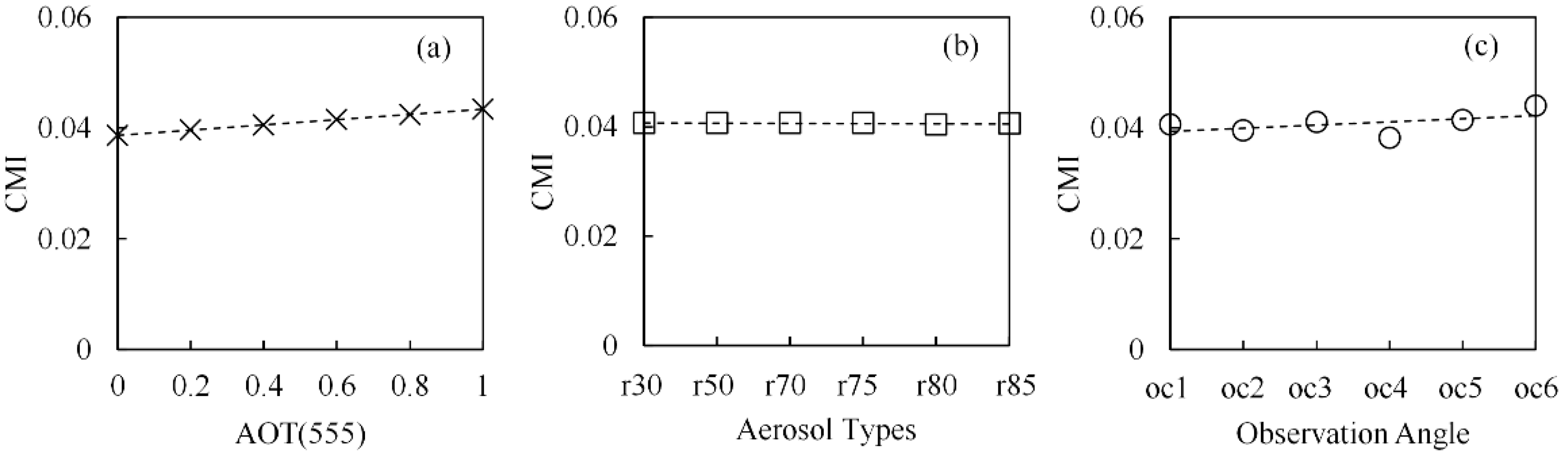 Considering MODIS Rayleigh corrected reflectance used in our research, in order to estimate atmospheric effects on CMI, we simulated the influence of the different atmospheric conditions on CMI using in situ reflectance measurements and an atmospheric radiance transfer model in the absence of whitecaps and sun glint (Equation 1). Aerosol optical thickness (0–1 at intervals of 0.2), six aerosol types (r30, 50, 70, 75, 80, and 85) and six typical solar/viewing geometry of Lake Taihu (oc1: solz = 40°, senz = 20°, phi = 40°; oc2: solz = 40°, senz = 20°, phi = −120°; oc3: solz = 40°, senz = 40°, phi = 40°; oc4: solz = 40°, senz = 40°, phi = −120°; oc5: solz = 60°, senz = 20°, phi = −120°; oc6: solz = 60°, senz = 20°, phi = 40°) were extracted from SeaDAS LUTs.