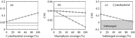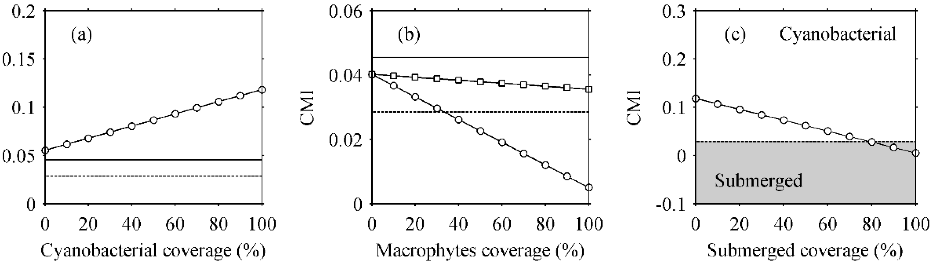 The best spatial resolution of MODIS data is 250 m, which is much rougher than that of Landsat TM/ETM+ and HJ-CCD. In order to assess mixed pixels effects on thresholds of CMI and FAI, a MODIS image with both of the cyanobacterial scums and all the kinds of macrophytes should be chosen in the following analysis. We therefore took the MODIS image on 9 August 2013 for an example to investigate the influence of mixed pixels on the thresholds of CMI and FAI by varying the fraction of cyanobacteria blooms, submerged macrophytes or emergent/floating macrophytes from 0% to 100% at intervals of 10%. However, first, the 5 × 5 pixels covering with only one of lake water, cyanobacteria blooms, submerged macrophytes or emergent/floating macrophytes were detected based on in situ investigations in 2013. Also, the average upper 25% values of CMI and FAI were determined as the pure pixel thresholds for cyanobacterial scums or emergent/floating macrophytes. The average lower 25% values of CMI and FAI were decided as the pure pixel threshold for submerged macrophytes. Then the CMI and FAI means of 5 × 5 lake water pixels were used as the pure lake water thresholds. A simple linear model was chosen with two endpoints: one was pure lake water, and the other was pure cyanobacterial scums, submerged macrophytes or emerged/floating-leaved macrophytes.