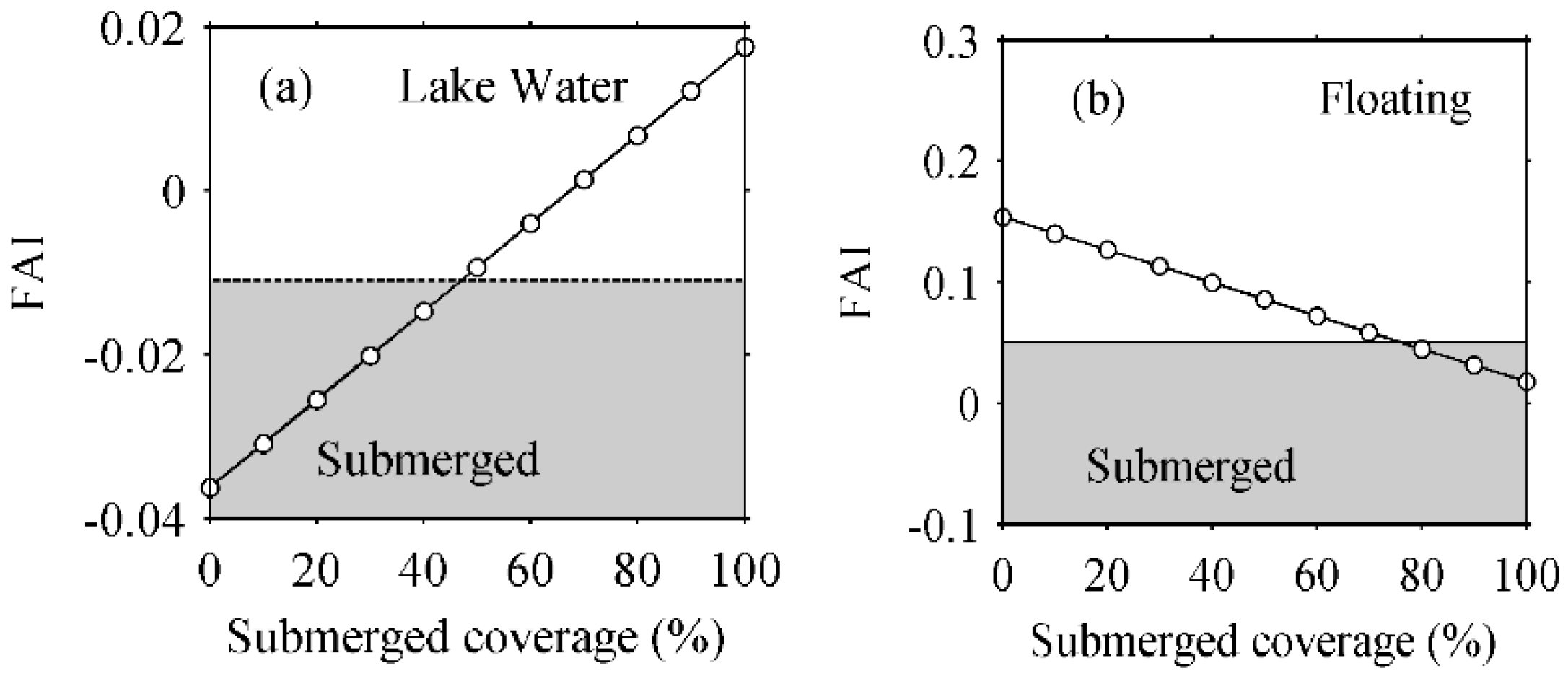 FAI, widely used for detecting floating algae in lakes [47,50] was expanded in this study to identify different types of aquatic macrophytes as well as floating algae. FAI was originally developed using MODIS red, NIR, and SWIR bands,