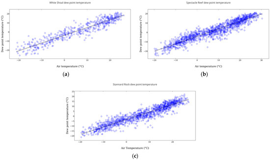 Here, we used the Clausius-Clapeyron equation (Equation (1) for the vapor pressure estimation at 30 m above the water surface. The Clausius–Clapeyron equation requires air temperatures to compute vapor pressure. To achieve this, we regressed the daily average hourly air temperature derived from MERRA reanalysis data with the daily average hourly dew point temperature from the lighthouse-based observations. The scatterplots of air temperature obtained from MERRA versus dew point temperature from the lighthouses is presented in Figure 2.