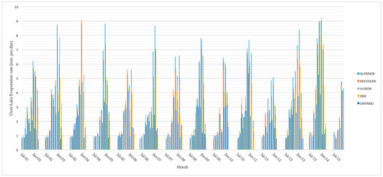 The over-lake cumulative evaporation was calculated based on monthly mean over-lake evaporation from July 2001 to December 2014. However, the calculations of the cumulative evaporation were based on the water year period beginning in October and ending in September of the following year (Table 7). Therefore, data from July to September 2001 and from October to December 2014 were not included. The highest annual cumulative evaporation was in 2014 in Lake Michigan (1162.1 mm) follow by Lake Huron (1103.9 mm). During the winter of 2013–2014, the Great Lakes experienced consistent lowest temperatures and highest ice cover in recent history [33]. Additionally, during this time Lake Superior had approximately 88% ice cover. With extent ice cover, therefore, the monthly cumulative evaporation of Lake Superior was found slightly lower than the Lake Michigan-Huron system. Evaporation of the Great Lakes is not spatially uniform, as evaporation rates vary with the movement of synoptic-scale air masses over the lake [34]. The evaporation begins in Lake Erie, Lake Ontario, and south of Lake Michigan as early as July. The highest evaporation rates tend to occur in the lateral regions of Lake Superior in January, particularly in the Thunder Bay area and then switches to offshore regions by January and February when ice cover begins to limit evaporation in near shore regions. The evaporation rate drops close to zero in April, May, and June before Lakes Erie, Ontario and South Michigan begin to evaporate again in July. It has also shown that Lake Superior does not start to evaporate again until August. Recent extreme ice extent in Lake Superior during winter 2013–2014 slightly hold the overall evaporation trend down. While other Lakes also experienced extreme ice extent, they were only partial covered, which in turn intensified evaporation. The evaporation rate in Lake Erie tends to increase nearly 0.9 mm per day while the Michigan–Huron system tendency was to roughly increase 0.4 mm per day. Lake Ontario had the lowest positive trend (~0.25 mm per day).