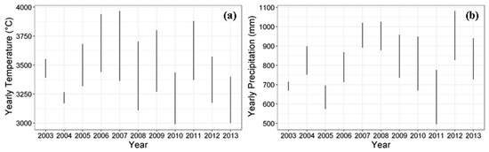 Range of interpolated data for Attert Catchment from 2003 to 2013: (a) yearly cumulative temperature; and (b) yearly cumulative precipitation.