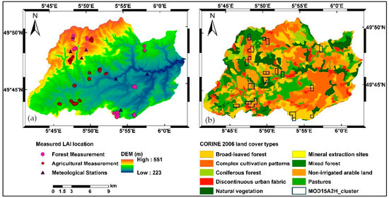 (a) DEM data with the measured LAI points in Attert Catchment; and (b) CORINE Land cover map overlaid by the blue boxes of MODIS pixels corresponding to the field measurements.