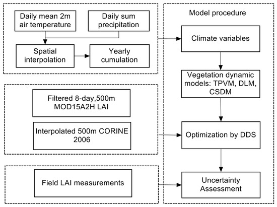 The model procedure lists the data preprocessing of climate variable, then implementation of the three vegetation dynamic models, and the uncertainty assessment comparing with the field measured LAI.