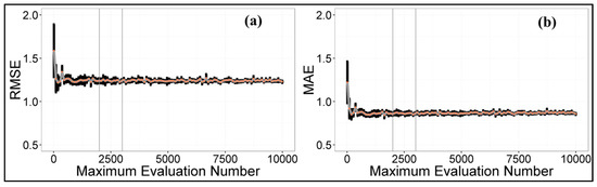 As introduced in Section 3, we firstly filter the MODIS LAI products with the mBISE method. Using the cumulative temperature and precipitation data as input, the CSDM, DLM and TPVM models are calibrated/optimized by applying the DDS method. In order to find an appropriate optimal “evaluation number” (the only hyper-parameter in the DDS-method), we tested the performance of the calibration by varying the evaluation number between values of 10 and 10,000 with increments of 90. As the DDS procedure involves random processes, each “evaluation number” test was repeated 10 times. Figure 5 displays the RMSE and MAE variations for each “evaluation number”. The orange points and black error bars represent the mean values and variations, respectively. In Figure 5a,b, we can see that the RMSE and MAE decrease dramatically with the increase of the maximum evaluation number and show stable variance ranges starting with a maximum evaluation number around 2000. Therefore, in this study, we set our evaluation number as 2500 for all the DDS runs.
