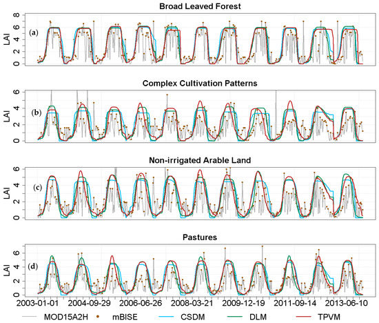 (a–d) LAI prediction data of each year from 2003 to 2013 based on the remaining 10-year’s calibration data for four land covers (broad-leaved forest, complex cultivation patterns, non-irrigated arable land, and pasture) were from the original MOD15A2H (grey lines), mBISE (red points), CSDM (cyan lines), DLM (green lines) and TPVM (red lines), respectively.