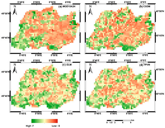 The LAI images of Attert Catchment on 28 July 2013 were, respectively, derived from: (a) MOD15A2H; (b) CSDM; (c) DLM; and (d) TPVM.