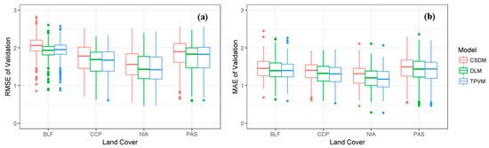 The goodness of fit measures between the MODIS LAI and the predicted LAI data using the three models (CSDM, DLM, and TPVM) for Attert Catchment: (a) RMSE for the four land cover types; and (b) MAE for the four land cover types. Considered land cover types are broad-leaved forest (BLF), complex cultivation patterns (CCP), coniferous forest (CF), mixed forest (MF), non-irrigated arable land (NIA), natural vegetation (NV), pastures (PAS).