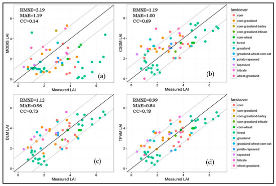 (a–d) Scatterplots comparing measured LAI values and the LAI data from MOD15A2H, CSDM, DLM and TPVM, respectively. The dark line indicates the 1:1 line and the two grey lines represent the lines with intercept of 1 and −1. The coloured points represent the different land covers according to the legend.