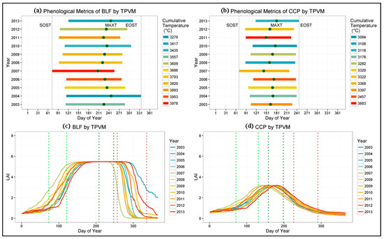 The growing season plots including the phenological metrics (SOST, MAXT, EOST) were derived from TPVM for two land covers: (a) broad-leaved forest (BLF); (b) complex cultivation patterns (CCP); and (c,d) the LAI dynamics in terms of day of year from 2003 to 2013 for BLF and CCP, respectively.