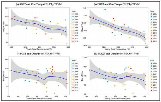 Climate variables relationship with the phenological metrics from 2003 to 2013 were plotted: (a) the relationship of SOST from broad-leaved forest (BLF) by TPVM and yearly cumulative temperature; (b) the relationship of EOST from BLF by TPVM and yearly cumulative temperature; (c) the relationship of SOST from non-irrigated arable land (NIA) by TPVM and yearly cumulative precipitation; and (d) the relationship of MAXT from NIA by TPVM and yearly cumulative precipitation.